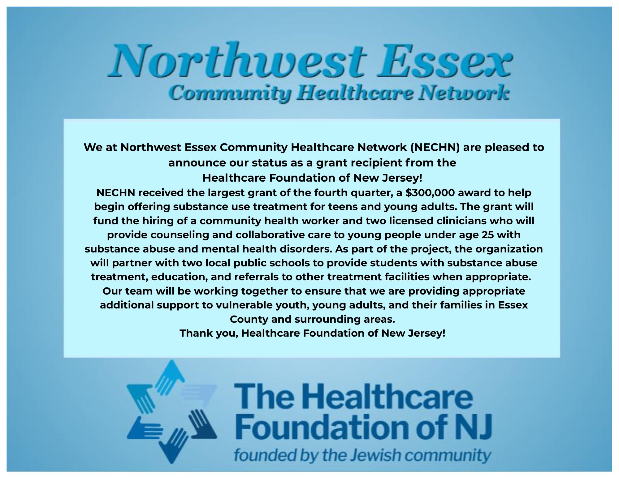 Northwest Essex Community Healthcare Network was awarded a SAMHSA grant to expand CCBHC services to 7 days per week including evenings. Northwest Essex Community Healthcare Network utilizes a Client Centered Treatment Planning approach which emphasizes consumer choice and self-direction.